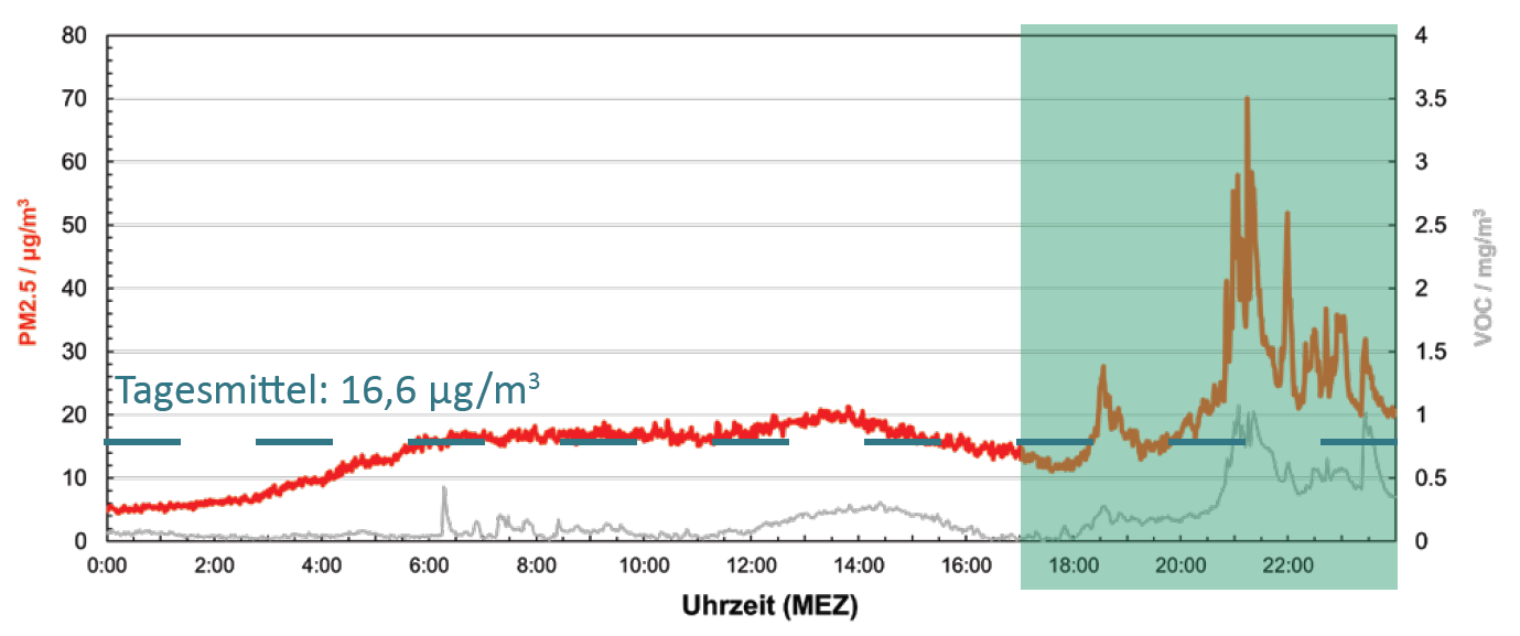 Am 7. Februar 2023 wurden in den Abendstunden Werte von bis 70 µg/m3, im Tagesmittel 16,6 µg/m3 gemessen. Der WHO-Tagesrichtwert liegt bei 15 µg/m3. (Abbildung 3)