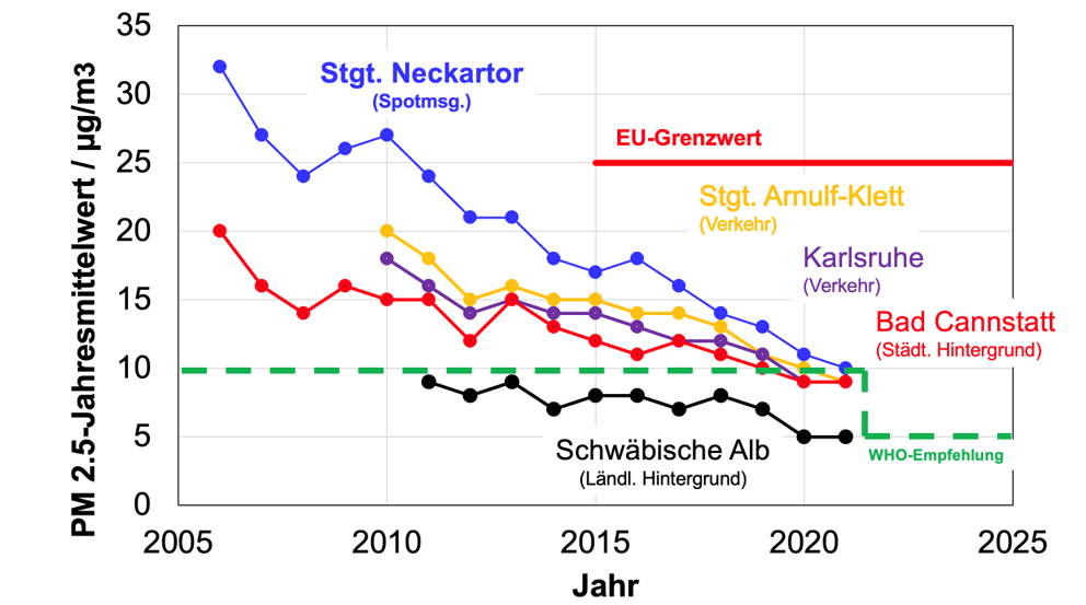 Die in Abbildung 2 dargestellten PM2,5-Werte (Jahresmittel) zeigen die Belastungen an Verkehrsstandorten in Baden-Württemberg im Vergleich zu städtischem und ländlichem Hintergrund. Trotz Verbesserungen in den letzten Jahren, ist die Abweichung zur aktuellen Empfehlung der Weltgesundheitsorganisation (WHO) deutlich.3
