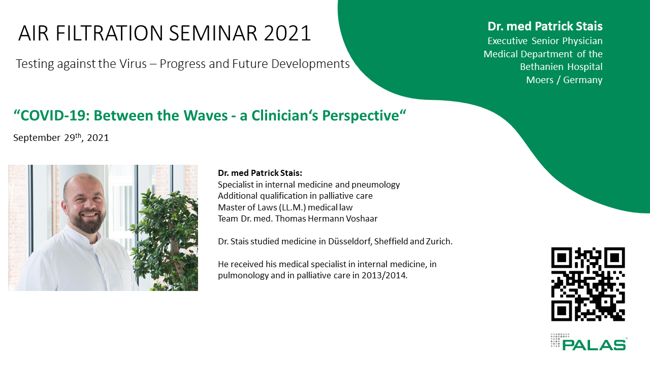 Für unser diesjähriges Air Filtration Seminar konnten wir Hr. Dr. Patrick Stais gewinnen. Der Leitende Oberarzt in der Medizinischen Abteilung des Bethanien-Krankenhauses in Moers wird einen Vortrag halten über "COVID-19: Zwischen den Wellen - die Sichtweise eines Klinikers". Wir sind gespannt, Sie auch?