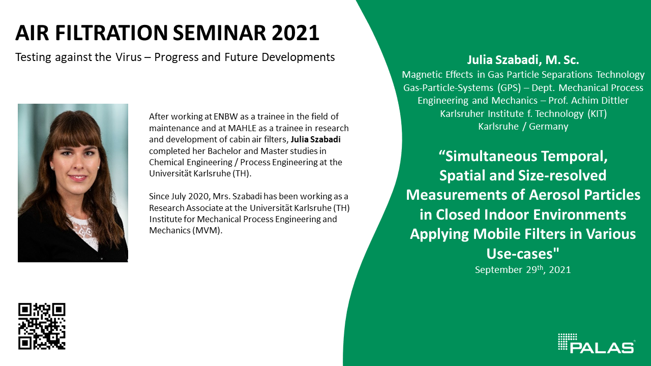 “Simultaneous Temporal, Spatial and Size-resolved Measurements of Aerosol Particles in Closed Indoor Environments Applying Mobile Filters in Various Use-cases". Mit diesem zugegeben etwas langen, doch interessanten Titel ihres Vortrags kommt Julia Szabadi vom Karlsruher Institute für Technology (KIT) zu unserem Air Filtration Seminar.