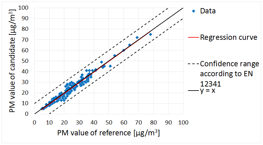 Fig. 3: PM10 reference equivalence function of the Fidas® 200 S in comparison with a reference small-filter device during suitability testing from the "Report on supplementary testing of the Fidas® 200 S respectively Fidas® 200 measuring system manufactured by Palas GmbH for the components suspended particulate matter PM10 and PM2.5, TÜV report no.: 936/21227195/B".