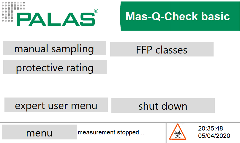 Palas® developed the Mas-Q-Check to subject protective masks to a quick, simple, and meaningful test before use. A particle-counting measurement device is used to detect efficiencies in the size range of viruses and bacteria. The system can also be used for training, as it immediately shows the efficiency of protective masks.