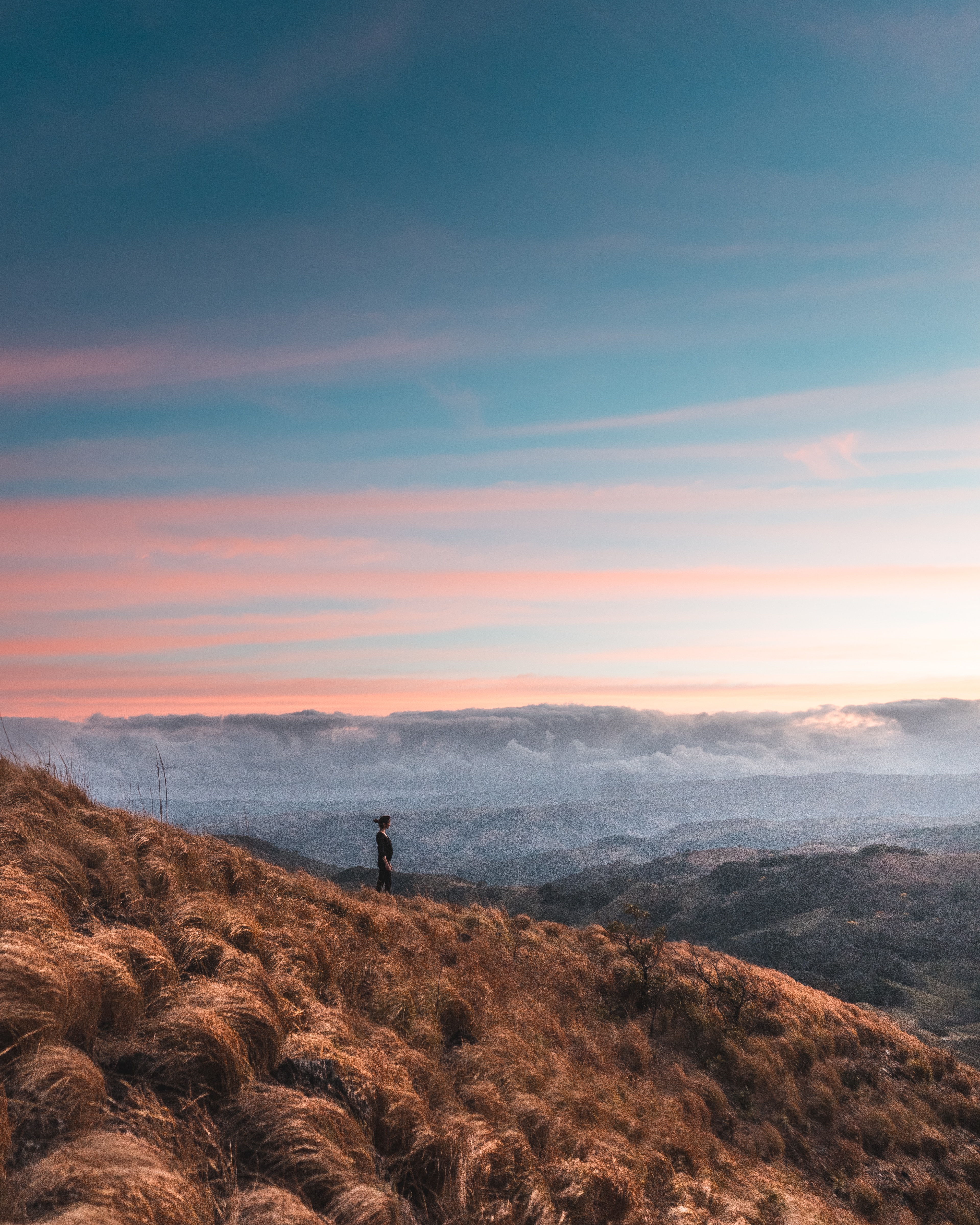 Breathtaking landscape capturing a woman on a mountain, enjoying clean air as she gazes down at a valley where clouds hover. The sunset paints the clouds in hues of pink and orange, creating a tranquil scene.
