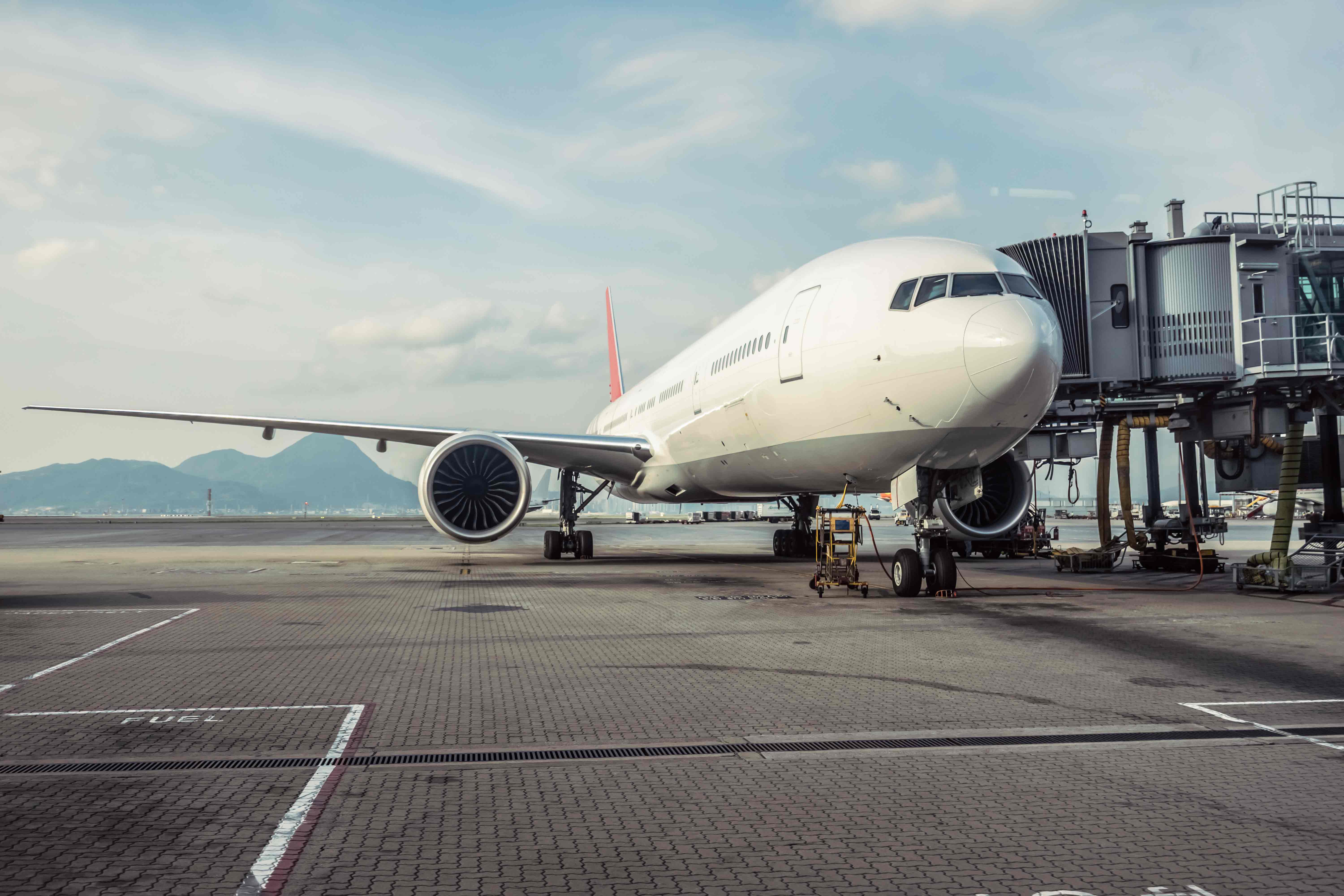Intriguing scene of an airplane on a runway, set against a backdrop of majestic mountains. Palas contributes to environmental awareness by monitoring ultrafine dust generated by air traffic.