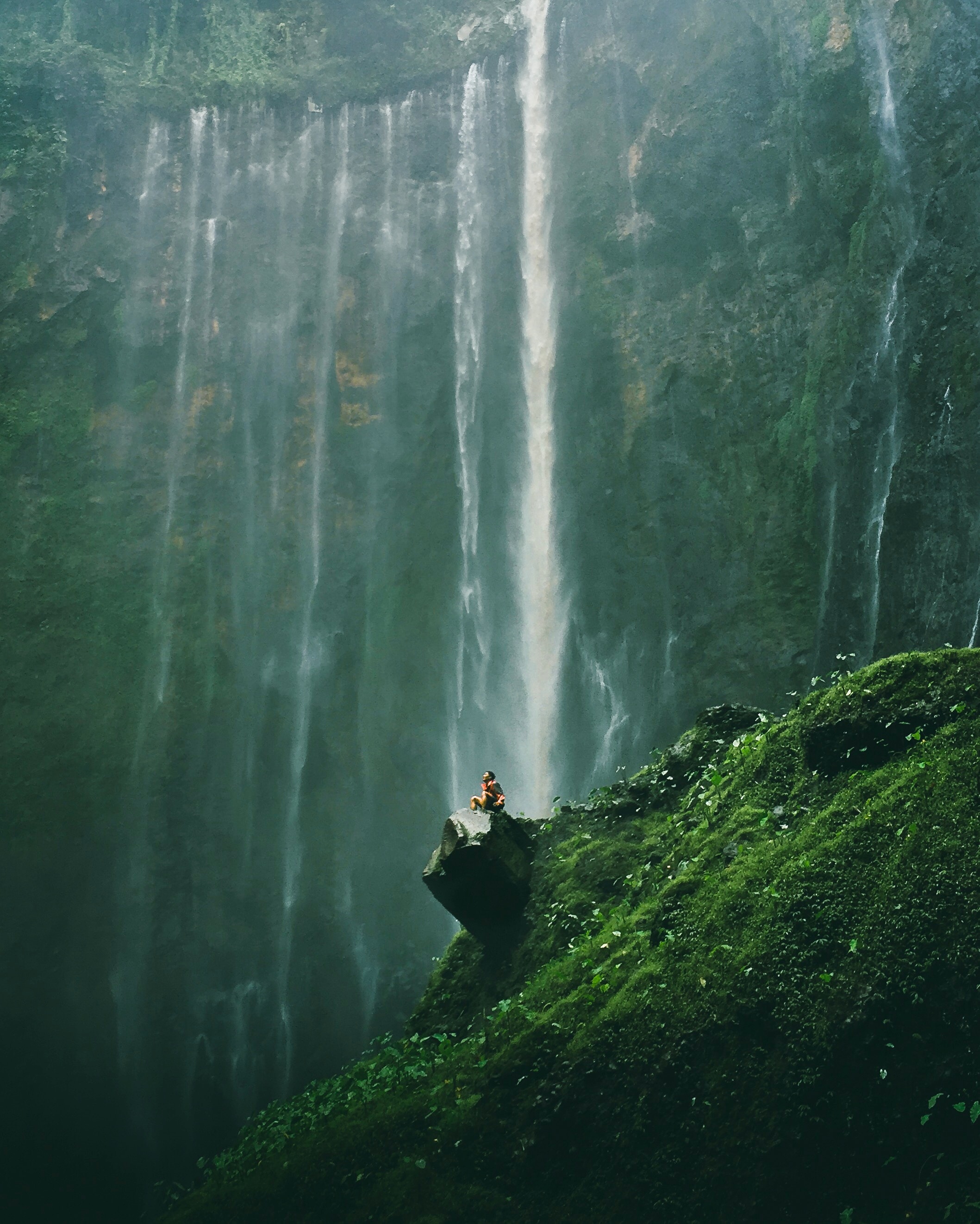 A serene scene capturing a man seated on a rock ledge, looking up towards a lush green forest, while behind him, a towering rock wall adorned with cascading waterfalls adds to the breathtaking natural setting.