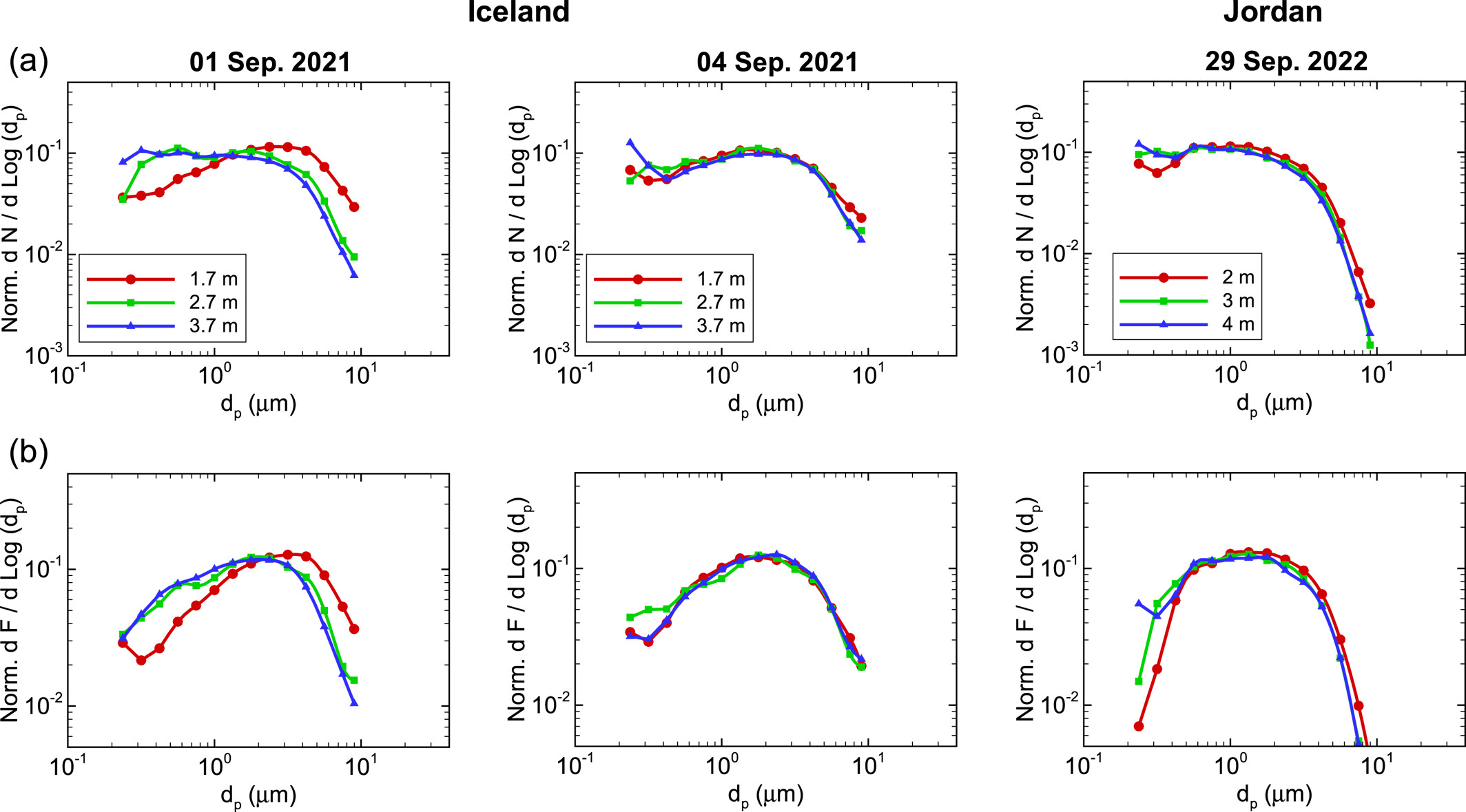 Comparison of ensemble-averaged size distributions of the dust concentration (a) and fluxes (b) in number between different height above the surface, for the 01 and 04 September events in Iceland and 29 September event in Jordan. Ensemble-averages were pe
