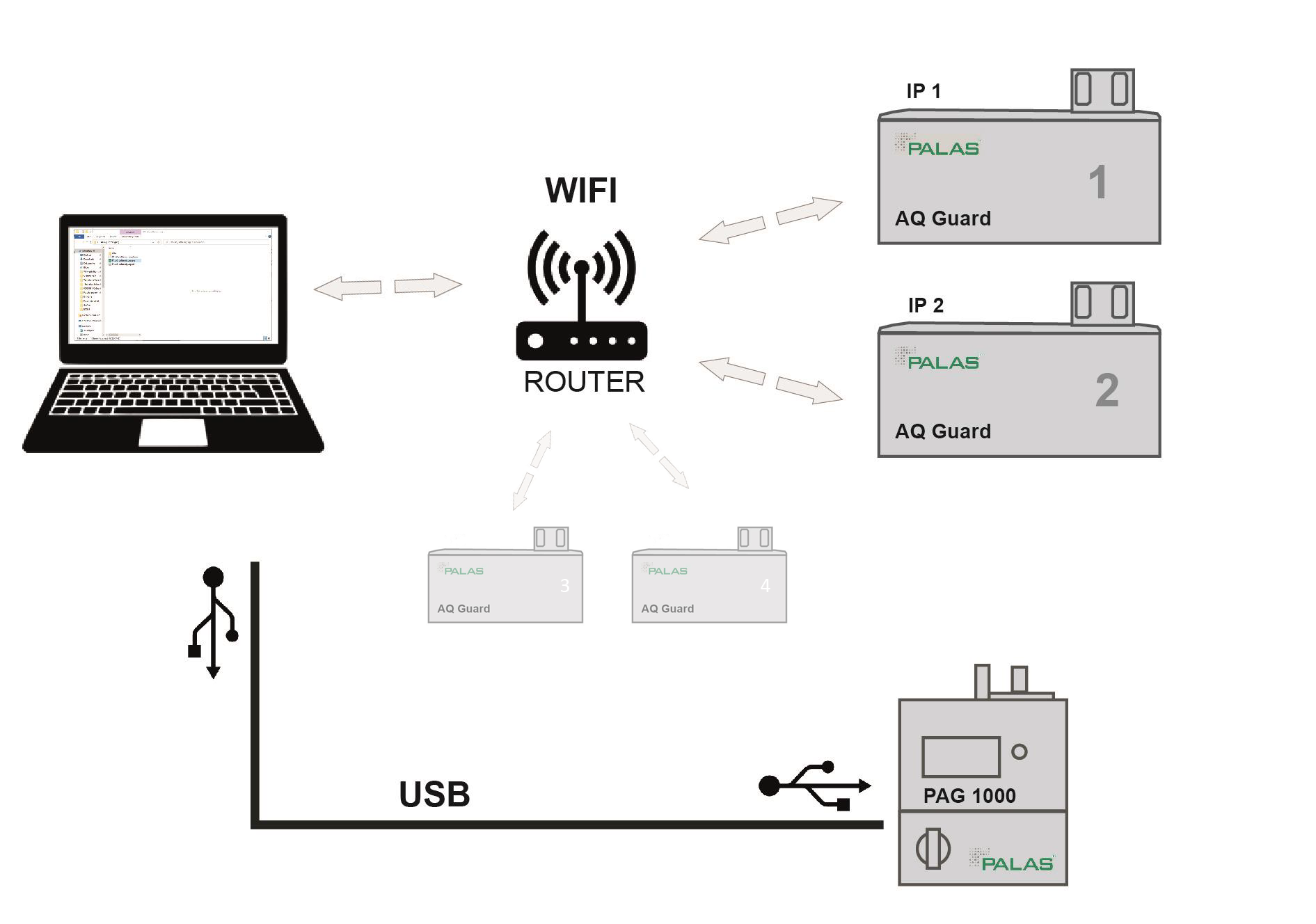 Dabei können bis zu vier Messgeräte des Typs AQ Guard und ein Aerosolgenerator PAG 1000 verknüpft und gesteuert werden. Verbindung der Messgeräte erfolgt über Wi-Fi, die des Aerosolgenerators über USB.