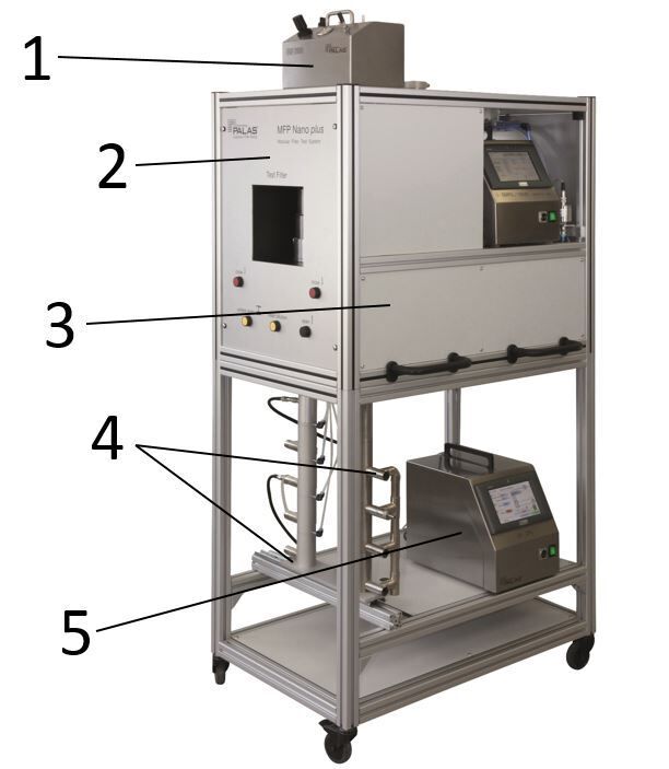 Der MFP Nanoplusist speziell für die eindeutige Bestimmung des Abscheidegrads von HEPA und ULPA Filtermedien nach DIN EN 1822-3 und ISO 29463-3 ausgelegt. Mit dem U-SMPS wird ein modernes und leistungsstarkes Nanopartikelmessgerät mit einem Messbereich von 5 nm bis 1 µm zur Partikelgrößen- und Mengenanalyse eingesetzt.